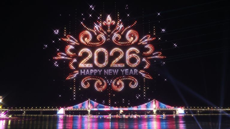 Image: Drones light up the night sky to celebrate the New Year in Busan, South Korea. Pic: Yonhap via AP