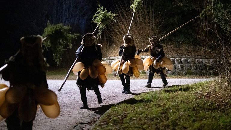 Image: Broom men with masks and air-filled pig bladders for the Achetringele procession in Switzerland. Pic: AP
