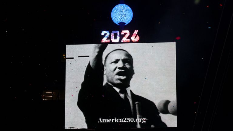 Image: A screen shows a photo of Martin Luther King Jr after the ball drop at Times Square. Pic: Reuters