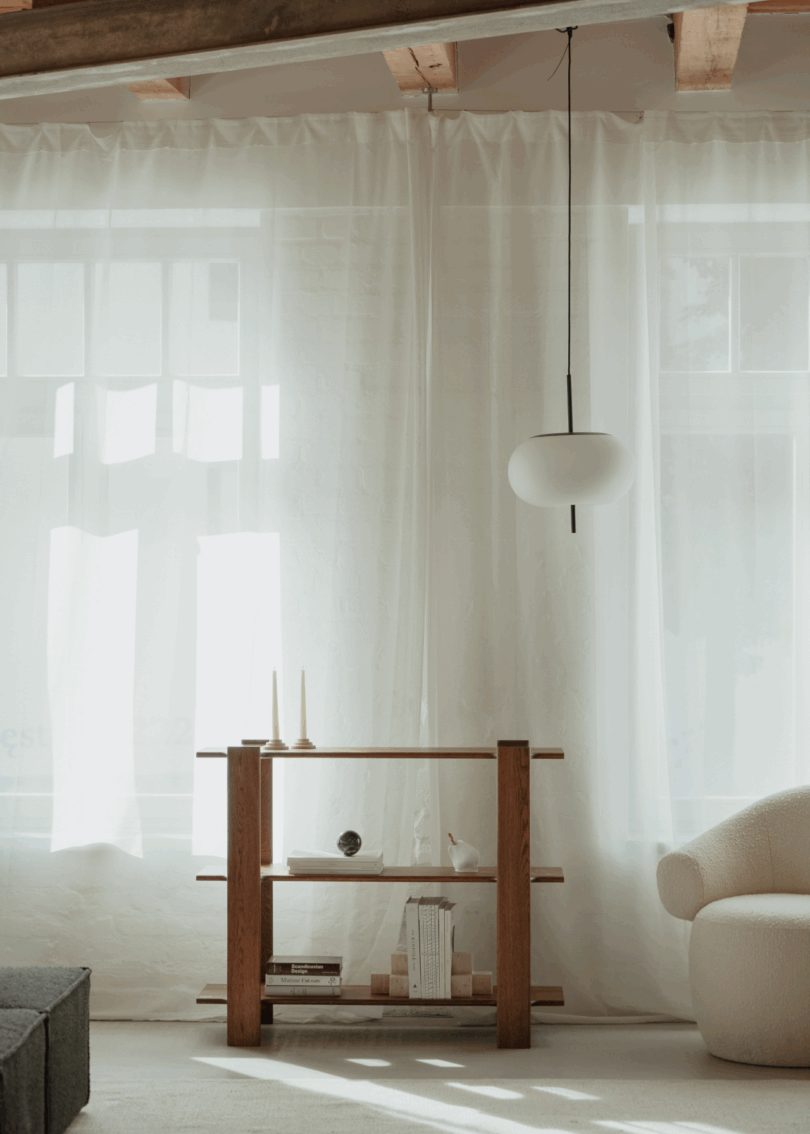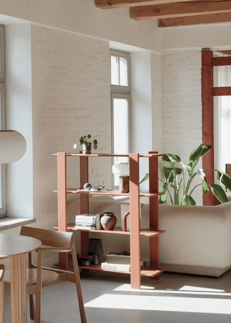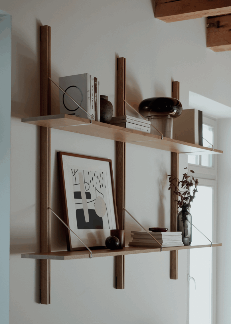 Designed by Ukrainian designer Max Voytenko, RODD was made for the moments when life needs to shift with you. Its solid oak boards rest on slender, profiled steel rods that slot into the wall-mounted rails, allowing each shelf to move up or down depending on what you choose to display. The result is a system that makes room – for tall vases, stacked books, or small collected objects – while maintaining the calm, balanced rhythm that defines its form.