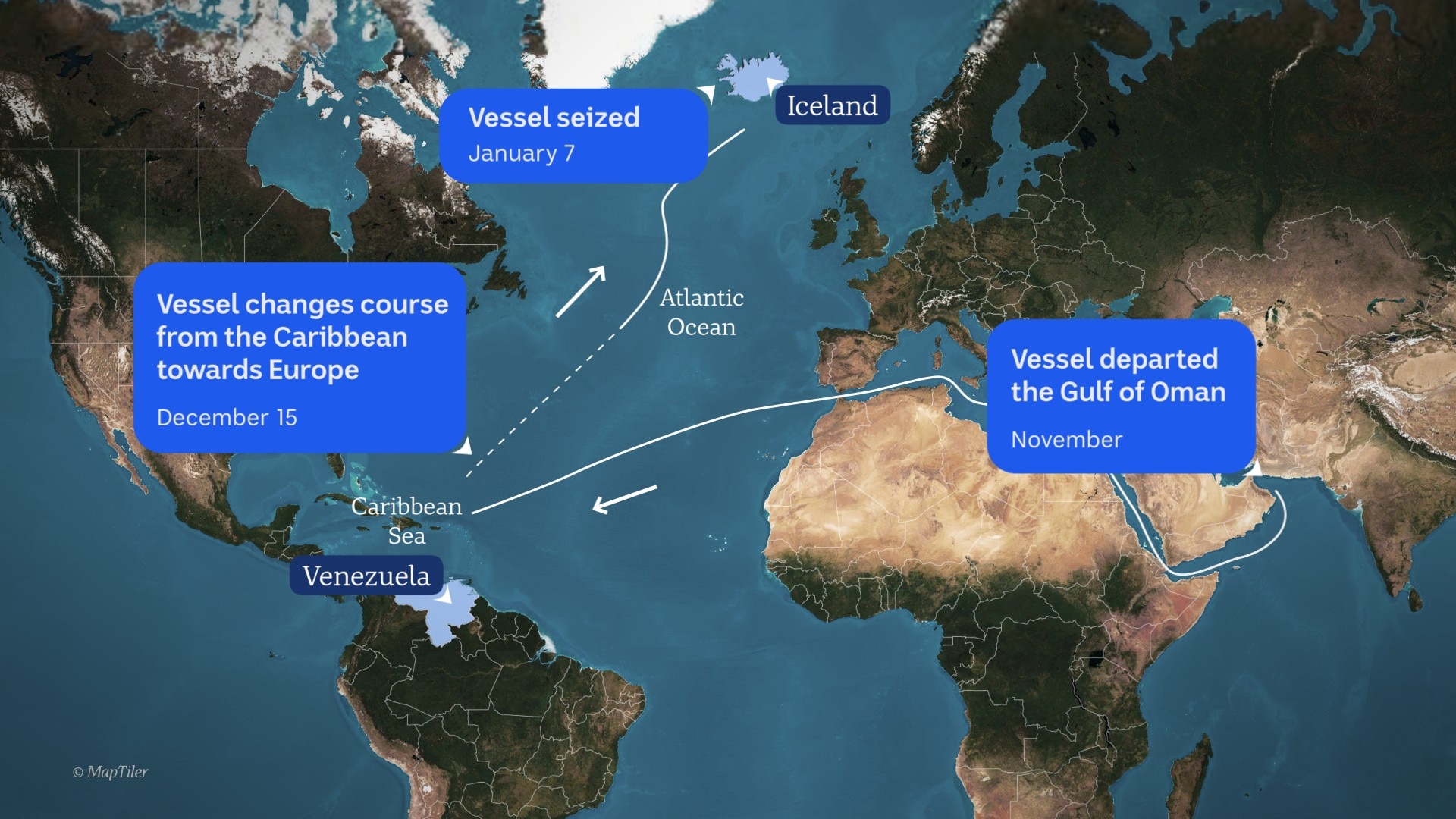 But the vessel abruptly changed course to avoid a US blockade in December, setting off a dramatic two-week chase at sea.