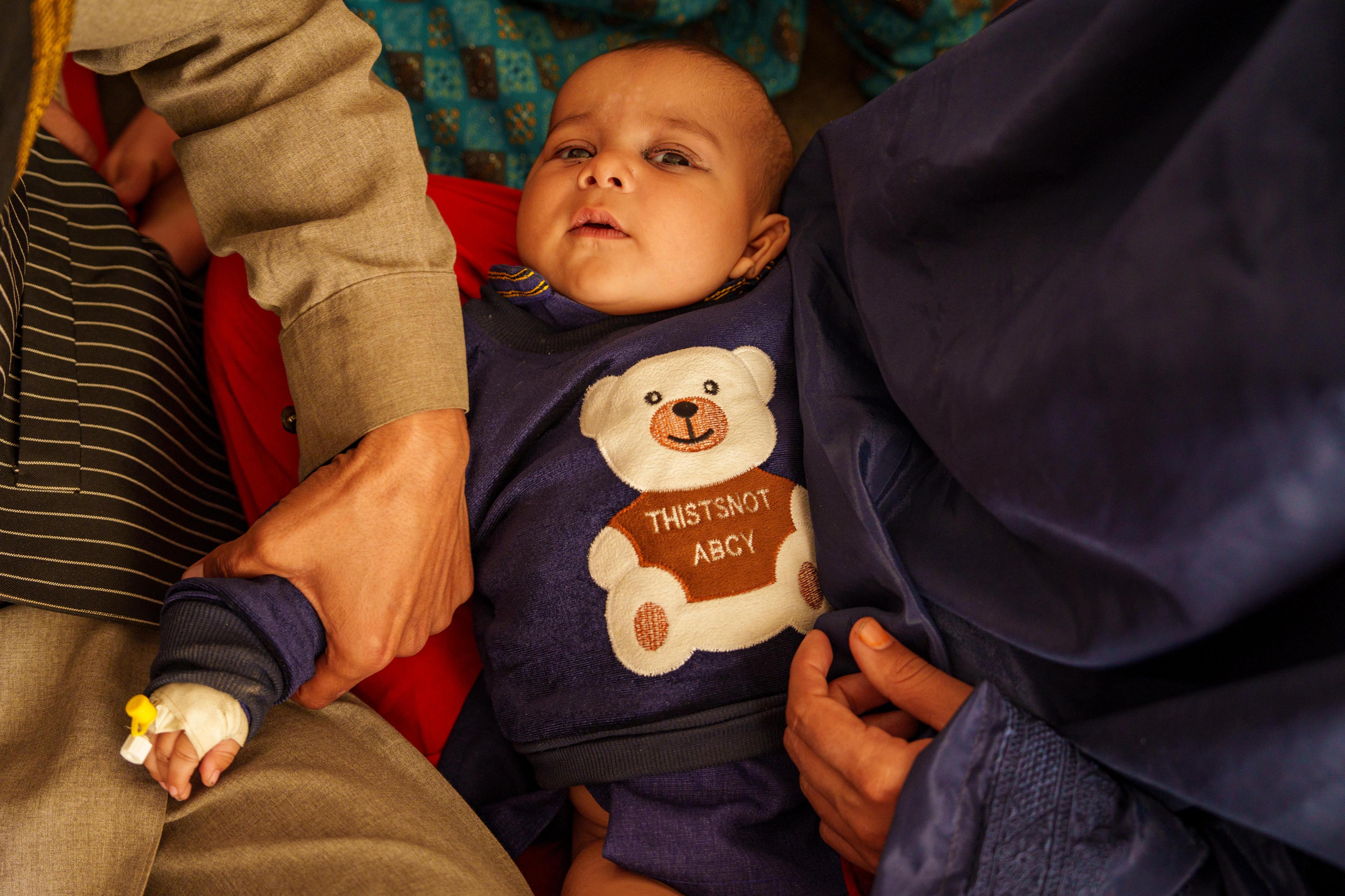 In the next bed, five-month-old Laila is wasting away. A doctor lifts her arm gently to check on her condition.
