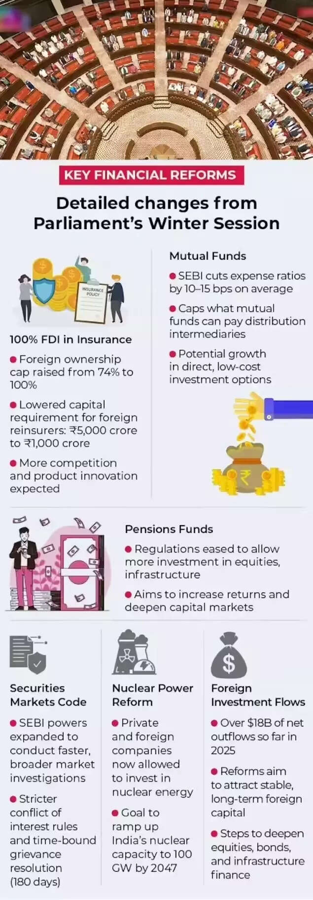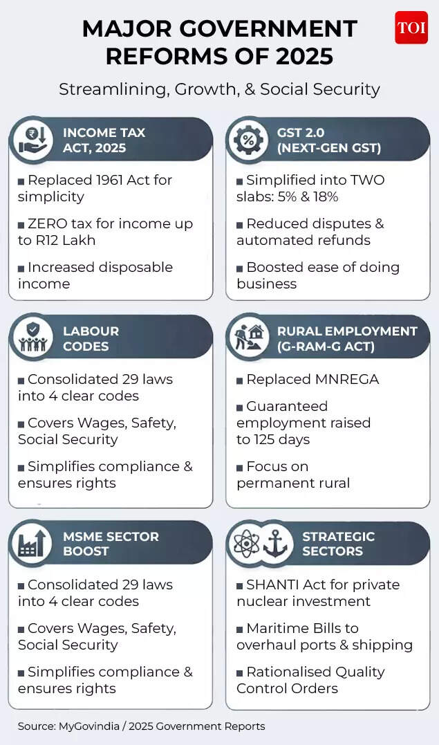 Driving the newsIt began with a tax relief for the middle class. It ended with a slew of reforms that had been put on hold for many years. By December-end, the 2025 turned out to be one of the most consequential years for Indian economy.In one of its busiest legislative sessions in years, parliament cleared a string of measures that had languished for decades or stalled amid political resistance: 100% foreign direct investment in insurance and pensions and private participation in nuclear power, and a new law, VB-G RAM G replacing MGNREGA.