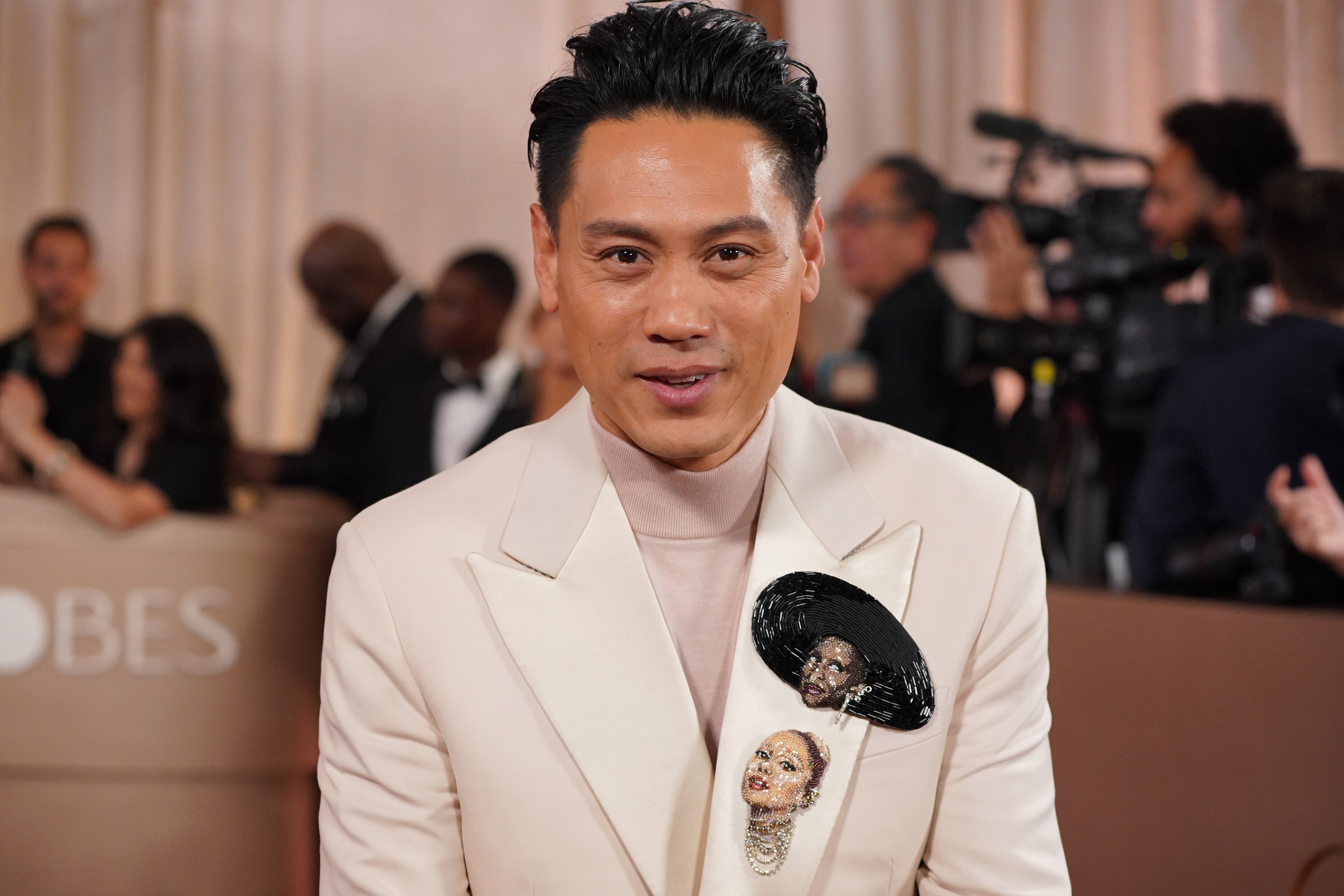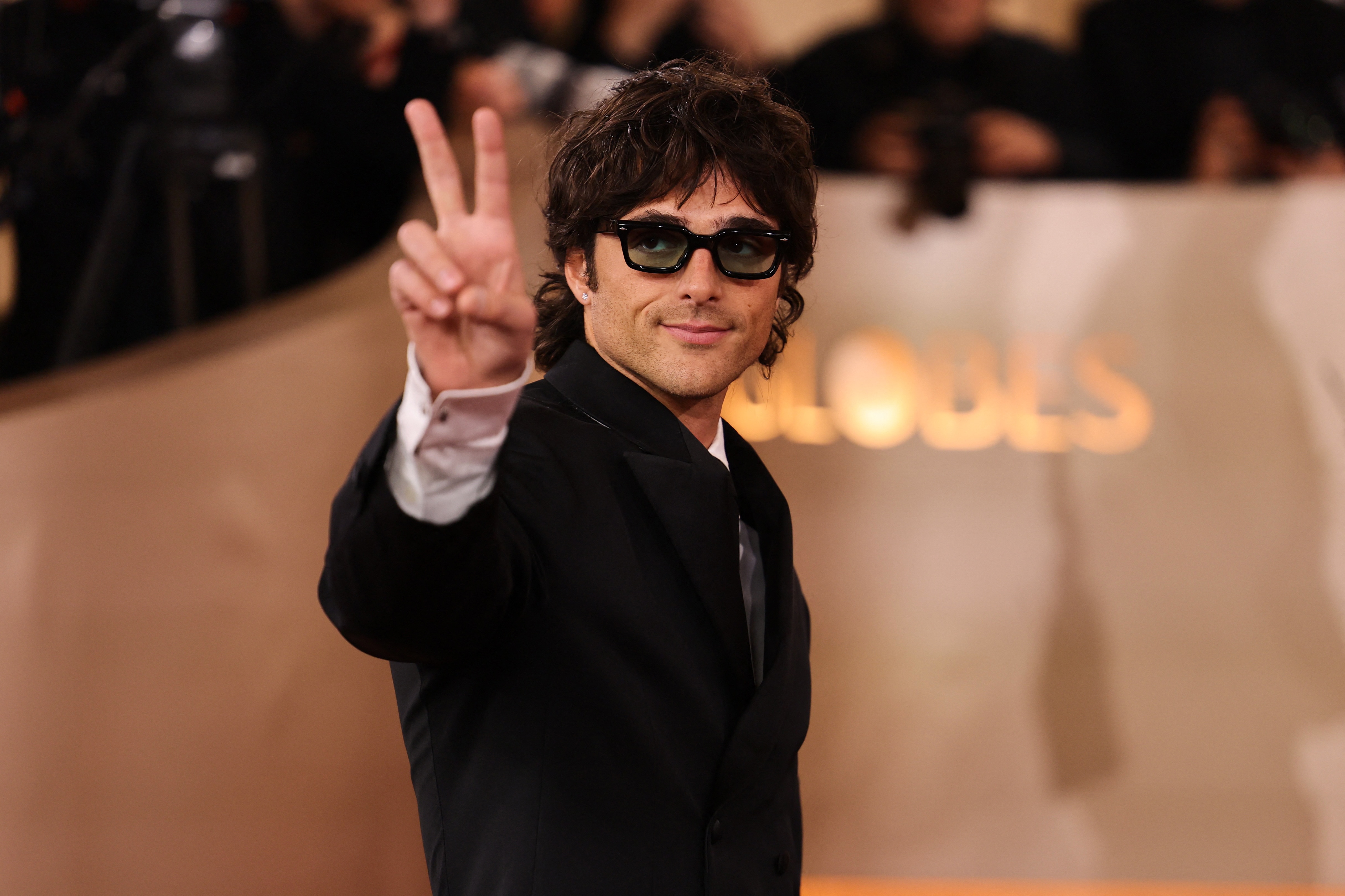 Heated Rivalry star Hudson Williams shows up for his first Golden Globes in a white jacket and serpentine necklace. (Reuters: Daniel Cole)