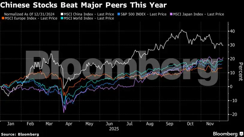 China has regained global investor confidence in a stellar year for stocks, with the MSCI China Index rising about 30%, adding $2.4 trillion in value and outperforming the S&P 500. Fund managers including Amundi, BNP Paribas, Fidelity and Man Group expect further gains in 2026, driven by AI innovation and market resilience, as both passive and active inflows fuel the rally.