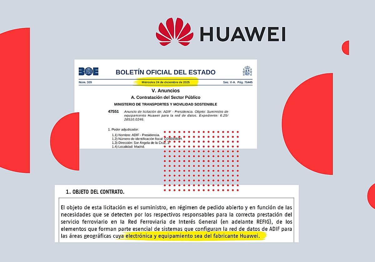 El Gobierno español sigue atándo a la Administración a Huawei pese a las reiteradas advertencias de sus aliados europeos y de Estados Unidos. Esta Nochebuena -uno de los días en que podía pasar más desapercibido- el Boletín Oficial del Estado publicó el anuncio de una licitación de Adif para el suministro de equipamiento del gigante chino para su red de datos. Huawei está obligado por las leyes de Seguridad Nacional y Ciberseguridad de su país a proporcionar al Partido Comunista cualquier dato que le requiera por lo que si este material implica conexión a internet en algún punto existe el riesgo claro de fuga de datos. El listado de equipos a adquirir incluye rúteres y 'switches' y fuentes oficiales de Adif aseguraron a ABC que no se conectarán a internet. Al respecto, expertos en ciberseguridad consultados por este periódico advirtieron que aunque este material se utilice para una red interna, si ésta se conecta en algún punto a internet también puede producirse una brecha de seguridad. Sin esa conexión los expertos consideran que la fuga de datos es «difícil» salvo que los equipos estén «trucados de fábrica», aunque matizan que esto «nunca se le ha demostrado» al gigante chino. Valorando todo ello, su conclusión es que «lo más prudente sería no comprar equipos de Huawei donde haya datos importantes para la seguridad». La integridad, control y ciberprotección de los datos de la infraestructura ferroviaria es estratégica ya que de ella dependen el transporte de viajeros y mercancías, tanto de nacionales como de extranjeros, e implica servicios esenciales y actividades económicas.Esta nueva licitación se produce en un clima de desconfianza instaurado por los crecientes vínculos del Gobierno de Pedro Sánchez con China, el 'lobby' que desarrolla la consultora de Pepe Blanco para Huawei, los viajes del expresidente José Luis Rodríguez Zapatero a aquel país asiático, y la opacidad del Gobierno sobre todo ello. La publicación del anuncio el día de Nochebuena no añade transparencia a este contexto. El importe de la licitación está valorado en hasta 484.000 euros por dos años incluyendo impuestos, y el presidente del administrador de las infraestructuras ferroviarias, Luis Pedro Marco de la Peña , quiere resolverlo rápidamente: el plazo para la presentación de ofertas expira el 12 de enero a las 10.00 horas, tan solo unos días después del final de las fiestas navideñas.Según el informe sobre el inicio del expediente, el objeto de la licitación es el suministro «en función de las necesidades que se detecten por los respectivos responsables para la correcta prestación del servicio ferroviario en la Red Ferroviaria de Interés General de los elementos que forman parte esencial de sistemas que configuran la red de datos de Adif para las áreas geográficas cuya electrónica y equipamiento sea del fabricante Huawei». Adif justifica la adquisición de estos materiales del gigante chino en que son «necesarios e imprescindibles para el buen funcionamiento de la red de datos en las labores de mantenimiento que requieran la sustitución de estos elementos». Es decir, que se trata en su mayoría de una renovación de repuestos para equipos del gigante chino comprados en el pasado porque éstos no son compatibles con otras tecnologías , lo que alerta respecto a la dependencia futura que implica contratar con Huawei. Esto sucede también con otros gigantes tecnológicos pero ni los europeos ni los estadounidenses están obligados a facilitar por ley a sus gobiernos los datos que estén en su poder. Y pese a las advertencias crecientes de los aliados internacionales de España no ha implementado ningún plan para desvincularse del gigante chino.Este verano, el polémico contrato adjudicado por el Ministerio del Interior a Huawei para el almacenamiento de escuchas judiciales provocó que el Congreso de Estados Unidos solicitara a la Administración Trump la revisión del envío de información de inteligencia a España para asegurar que esos datos no puedan acabar después en manos del gobierno chino. Tanto Interior como el Gobierno español aseguraron que se trata de un sistema totalmente estanco que no tiene conexión a internet.La UE lanzó varias advertencias a España sobre la necesidad de blindar la información estratégica frente a Huawei. Bruselas, por ejemplo, ha puesto como condición para recibir ayudas al despliegue de las redes de 5G que los proyectos no cuenten con ningún dispositivo del gigante chino.Licitación «abierta»La licitación que planeta Adif es abierta por lo que puede presentarse cualquier proveedor pero el gigante chino gana de partida ya que el material a comprar es de fabricación suya, aunque lo suministre un tercero a cambio, probablemente, de una comisión. No obstante, el criterio que decidirá la adjudicación es solo uno, el precio más bajo, por lo que si Huawei quiere presentarse tiene todas las opciones de presentar la oferta más barata, aunque esto no cambiará demasiado su beneficio final con la operación. La Ley de Contratos del Sector Público obliga a incluir más de un criterio de adjudicación pero permite hacer la excepción cuando «los productos a adquirir estén perfectamente definidos y no sea posible variar los plazos de entrega ni introducir modificaciones de ninguna clase en el contrato, siendo por consiguiente el precio el único factor determinante de la adjudicación». Adif considera que esta excepción es aplicable ya que «la prestación se encuentra perfectamente definida y no es susceptible de ser mejorada por modificaciones de ninguna clase y tampoco se considera una ventaja para ADIF el adelanto en los plazos requeridos». Quienes aspiren a hacerse con este contrato tendrán que garantizar su solvencia económica y financiera. Aunque el presupuesto máximo es de 484.000 euros, las unidades de equipamiento licitadas son estimadas y se irán ejecutando «en función de las neces
