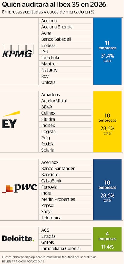 En este nuevo ejercicio, KPMG, presidida en España por Juanjo Cano, mantiene el liderazgo en el Ibex 35 con 11 auditorías (Acciona Energía, Acciona, Aena, Banco Sabadell, Endesa, Iberdrola, IAG, Rovi, Mapfre, Naturgy y Unicaja). Le sigue PwC, liderada por Gonzalo Sánchez, con 10, que gana un cliente con respecto a 2025 (Acerinox, Banco Santander, Bankinter, CaixaBank, Indra, Merlin Properties, Repsol, Sacyr, Telefónica y Ferrovial). Lo hace empatada con con la firma que dirige Federico Linares. EY pierde la auditoría de una empresa del selectivo (Amadeus, Arcelormittal, BBVA, Logista, Fluidra, Inditex, Puig, Redeia, Solaria y Cellnex).
