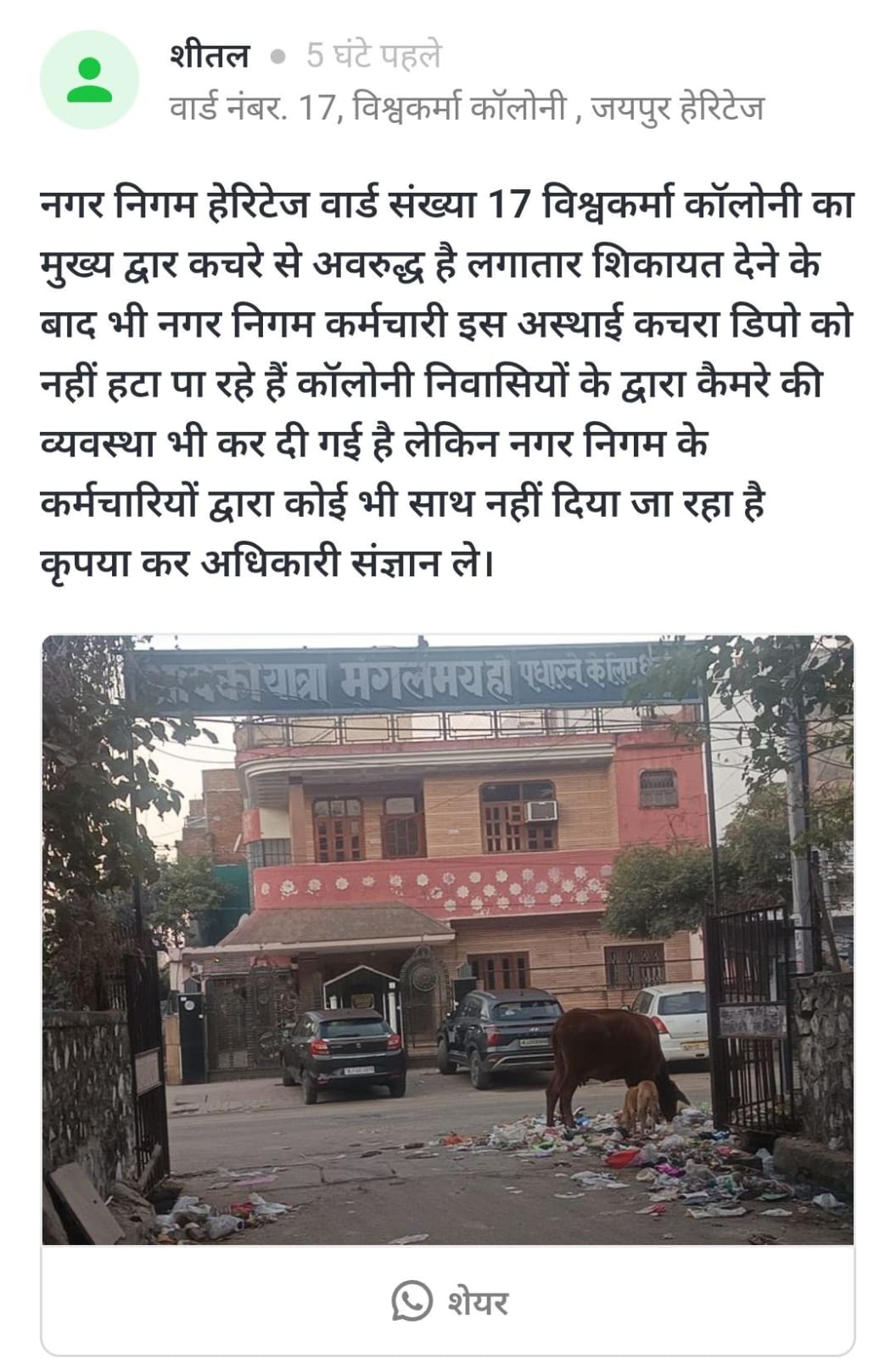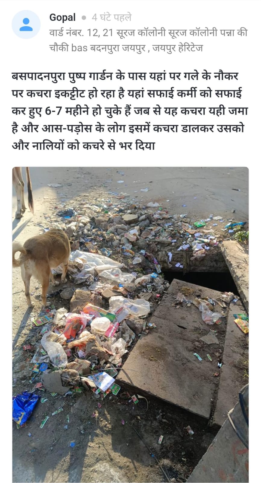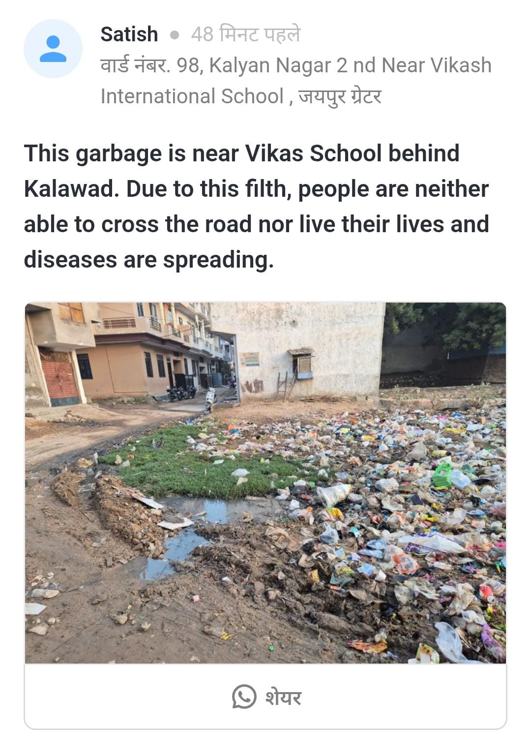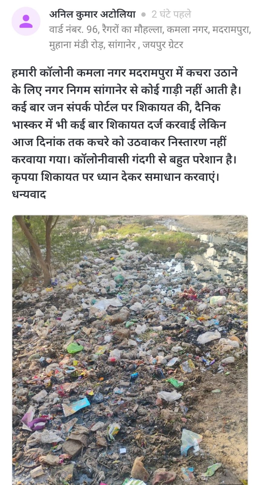 जयपुर शहर के कई वार्डों से सिविक इश्यू के तहत कचरे की गंभीर समस्या सामने आ रही है। जगह-जगह कचरे के ढेर, नालियों के बाहर जमा गंदगी और समय पर सफाई नहीं होने से हालात लगातार बिगड़ते जा रहे हैं। स्थानीय लोगों का कहना है कि नगर निगम में बार-बार शिकायतें दर्ज कराने के बावजूद स्थायी समाधान नहीं हो पा रहा है। कई इलाकों में महीनों से कचरा जमा है, जिससे बदबू फैल रही है और आसपास का माहौल अस्वच्छ हो गया है। नालियों के पास कचरा जमा होने से मच्छरों का प्रकोप बढ़ रहा है, जिससे डेंगू, मलेरिया और अन्य बीमारियों का खतरा बना हुआ है। बच्चों और बुजुर्गों को सबसे ज्यादा परेशानी का सामना करना पड़ रहा है। ऐसी ही आमजन की रोजमर्रा की परेशानियों और शहर की जमीनी हकीकत को पढ़ने के लिए दैनिक भास्कर के सिविक इश्यू सेगमेंट पर क्लिक करें। कचरा उठाने वाली गाड़ी नियमित रूप से नहीं आती वार्ड 96, मुहाना मंडी में रहने वाले अनिल कुमार ने शिकायत की है कि उनके इलाके में कचरा उठाने वाली गाड़ी नियमित रूप से नहीं आती, जिससे सड़कों पर कचरे के ढेर लग गए हैं। कई बार नगर निगम को अवगत कराने के बावजूद अब तक कोई समाधान नहीं हुआ। गंदगी के कारण पूरे क्षेत्र में बदबू फैली रहती है और संक्रमण का खतरा बना हुआ है। पिछले 6–7 महीनों से कचरा जमा है वार्ड 12, सूरज कॉलोनी में रहने वाले गोपाल ने बताया कि गली के नुक्कड़ पर पिछले 6–7 महीनों से कचरा जमा है, लेकिन अब तक सफाई नहीं हुई। इससे पूरी कॉलोनी में गंदगी फैल रही है, लोगों को आने-जाने में भी परेशानी झेलनी पड़ रही है। स्कूल के पास रोज कचरा जमा हो जाता है वार्ड 98, कल्याण नगर में रहने वाले सतीश ने बताया कि उनके इलाके में स्कूल के पास रोज कचरा जमा हो जाता है। आसपास रिहायशी क्षेत्र होने के कारण बदबू और गंदगी से लोगों को भारी परेशानी हो रही है। कचरा नियमित रूप से नहीं उठने की वजह से पूरे इलाके में दुर्गंध फैली रहती है। क्षेत्र में काफी समय से कचरा जमा है वार्ड 17, विश्वकर्मा कॉलोनी में शीतल ने बताया कि उनके क्षेत्र में काफी समय से कचरा जमा है। नगर निगम को सूचना देने के बावजूद समस्या जस की तस बनी हुई है। उनका कहना है कि अगर समय रहते सफाई नहीं हुई, तो हालात और गंभीर हो सकते हैं। आम जनता का आरोप है कि कई जगह सिर्फ औपचारिक सफाई कर दी जाती है। कचरा पूरी तरह हटाया नहीं जाता और कुछ मुख्य सड़कों पर कचरा पात्र तक नहीं लगाए गए हैं। मजबूरी में लोग सड़क किनारे ही कचरा फेंक रहे हैं, जिससे समस्या और बढ़ रही है। जनता ने अब नगर निगम से नियमित सफाई, कचरा उठाने की व्यवस्था और पर्याप्त कचरा पात्र लगाने की मांग की है। लोगों का कहना है कि अगर जल्द ठोस कदम नहीं उठाए गए, तो शहर में बीमारियों का खतरा और बढ़ सकता है। आप भी कर सकते है पोस्ट अब लोग अप