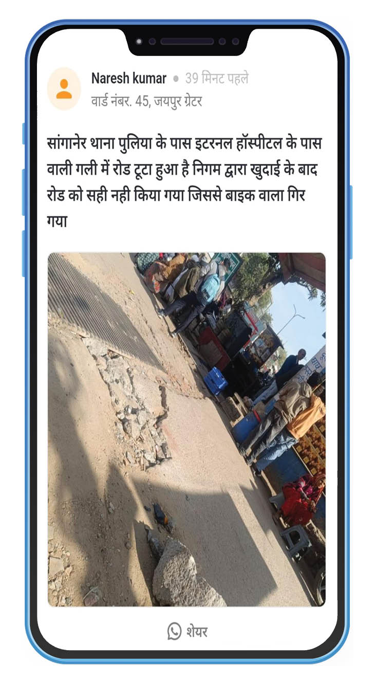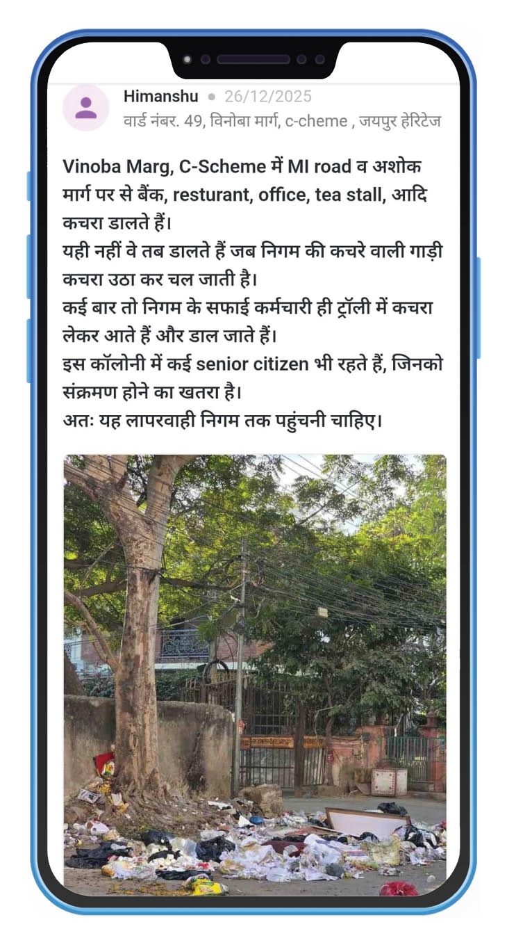 जयपुर शहर के अलग-अलग वार्डों से सिविक इश्यू के तहत टूटी सड़कों, गंदगी और बंद स्ट्रीट लाइट को लेकर लगातार शिकायतें सामने आ रही हैं। जनता का कहना है कि बार-बार शिकायत दर्ज कराने के बावजूद समस्याओं का समाधान नहीं हो पा रहा है, जिससे आमजन की रोजमर्रा की जिंदगी प्रभावित हो रही है। शहर के कई इलाकों में नालियों के पास जमा कचरे की वजह से मच्छर पनप रहे हैं, जिससे बीमारियों का खतरा बढ़ गया है। बच्चों और बुजुर्गों को सबसे ज्यादा परेशानी झेलनी पड़ रही है। स्थानीय लोगों का आरोप है कि कई जगह केवल औपचारिक सफाई कर दी जाती है, लेकिन कचरा पूरी तरह नहीं हटाया जाता। वहीं, कई मुख्य सड़कों पर कचरा पात्र तक नहीं लगाए गए हैं, जिससे लोग मजबूरी में सड़क किनारे ही कचरा फेंक रहे हैं। ऐसी ही आमजन की रोजमर्रा की परेशानियों और शहर की जमीनी हकीकत को पढ़ने के लिए दैनिक भास्कर के सिविक इश्यू सेगमेंट पर क्लिक करें। वार्ड नंबर 45, सांगानेर थाना क्षेत्र से नरसेह ने शिकायत की है कि इंटरनल हॉस्पिटल के पास वाली गली की सड़क पूरी तरह टूट चुकी है। सड़क की हालत इतनी खराब है कि मरीजों, उनके परिजनों और स्थानीय निवासियों को आवागमन में भारी परेशानी का सामना करना पड़ रहा है। बरसात के समय यहां पानी भर जाता है, जिससे फिसलन और हादसों का खतरा बढ़ जाता है। वार्ड नंबर 148, तिलक नगर से सत्विक ने बताया कि एसबीआई बैंक के पास की गली में भारी मात्रा में कचरा जमा है। समय पर सफाई नहीं होने से बदबू फैल रही है और आसपास रहने वाले लोग परेशान हैं। स्थानीय निवासियों का कहना है कि कई बार सफाई के लिए शिकायत की गई, लेकिन अब तक कोई ठोस कार्रवाई नहीं हुई। वार्ड 49, विनोबा मार्ग से हिमांशु ने बताया कि इलाके में मौजूद चाय की दुकानों और रेस्टोरेंट के कारण लगातार गंदगी फैल रही है। नगर निगम की सफाई के बाद भी दुकानदार और लोग सड़क पर कचरा फेंक देते हैं, जिससे इलाके में बीमारियों का खतरा बढ़ गया है। वार्ड नंबर 115, कुंभा मार्ग से नवल शर्मा ने शिकायत की है कि उनके क्षेत्र की रोड लाइट पिछले तीन महीनों से बंद है। अंधेरे के कारण रात के समय असुरक्षा का माहौल बना रहता है, हादसों का डर बना हुआ है। आम जनता ने नगर निगम से मांग की है कि सफाई व्यवस्था को नियमित किया जाए, टूटी सड़कों की जल्द मरम्मत कराई जाए और बंद रोड लाइट को तुरंत चालू किया जाए, ताकि शहरवासियों को राहत मिल सके। आप भी कर सकते है पोस्ट अब लोग अपनी बात सीधे दैनिक भास्कर ऐप पर रख रहे हैं। दैनिक भास्कर ऐप के 'सिविक इश्यू' सेक्शन में गली या मोहल्ले की समस्या लिखकर और फोटो लगाकर पोस्ट की जा सकती है। अगर आपने इस सेक्शन में किसी समस्या को लेकर पोस्ट किया और उसका समाधान हो गया है तो आप पोस्ट कर बता सकते हैं कि आपकी समस्या का समाधान हो। य