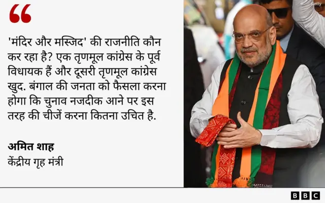 चुनाव से पहले पश्चिम बंगाल में दौरे करते समय गृह मंत्री अमित शाह ने कहा, "'मंदिर और मस्जिद' की राजनीति कौन कर रहा है? एक पूर्व तृणमूल कांग्रेस विधायक हैं और दूसरी तृणमूल कांग्रेस खुद. बंगाल की जनता को फैसला करना होगा कि चुनाव नजदीक आने पर इस तरह की चीजें करना कितना उचित है."