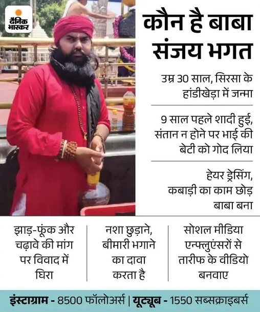 हरियाणा के सिरसा में झाड़े की आड़ में महिला के निजी अंग से छेड़छाड़ के वीडियो से विवादों में घिरा हांडी खेड़ा बाबा यानी संजय भगत फिर सुर्खियों में है। इस बार उसकी चर्चा पत्नी के वीडियो को लेकर है। इस वीडियो में संजय की पत्नी पूजा मोबाइल आगे रखकर किसी को ऑनलाइन झाड़ा लगा रही है। वह झाड़े से नशा छुड़वाने और ग्रह दोष दूर करने का दावा कर रही है। इससे पहले सिरसा के हांडी खेड़ा गांव के लोगों ने संजय भगत का विरोध किया था। ग्रामीणों ने घेरेबंदी करके उसके दरबार में आने से लोगों को रोका। उसके बाद संजय भगत अपना टीन-टप्पर उठाकर बीकानेर के अर्जुनसर में नया डेरा बनाने पहुंच गया। इससे पहले उसे डेरा जमता वहां के लोगों को उसके वायरल वीडियो के बारे में पता चल गया। यहां भी उसका विरोध शुरू हो गया। पुलिस पहुंची और बाबा को वहां से खदेड़ दिया गया। उसके बाद से संजय भगत अपने गांव हांडी खेड़ा लौट आया। यहां अभी वह दरबार व झाड़ा लगाने से दूर है। इसी बीच उसकी पत्नी के झाड़ा लगाने का वीडियो सामने आ गया। इस मामले में संजय भगत का कहना है कि बाबा की कृपा किसी पर भी हो सकती है। मोबाइल सामने रख वीडियो कॉल पर नशेड़ी को झाड़ा वीडियो में दिख रहा है कि पूजा गद्दी पर बैठी है। सामने मोबाइल रखा है, जिसमें किसी नशेड़ी से वीडियो कॉल चल रही है। इस दौरान पूजा लगातार मोबाइल पर मोर पंख से झाड़ा दे रही है। बताया जा रहा है कि धाम में भीड़ में लोगों को और ऑनलाइन दोनों तरह से झाड़ा लगा रही है। यह वीडियो दिल्ली के राधिका धाम का बताया जा रहा है। यह जगह दिल्ली में राजधानी पार्क मेट्रो स्टेशन के पास बताई जा रही है। हांडी खेड़ा के ग्रामीणों का कहना है कि इससे पहले इस महिला काे झाड़ा लगाते नहीं देखा। राजस्थान से खदेड़ने के बाद कभी-कभार दिख रहा संजय भगत ग्रामीणों ने बताया कि संजय भगत राजस्थान से आने के बाद करीब एक महीने गांव हांडी खेड़ा में रहा। जब संजय भगत ने गांव में दोबारा दरबार लगाने की कोशिश की तो ग्रामीणों ने फिर विरोध शुरू कर दिया। इसके चलते संजय अपने घर पर ही झाड़े लगाने लगा। इस बीच कभी-कभार वह गांव से बाहर रहने लगा। कई-कई दिन तक बाहर रहा। अब अचानक संजय की पत्नी पूजा झाड़े लगाने लगी। कम पढ़ी-लिखी, अभी तक घर ही संभाल रही थी ग्रामीणों का कहना है कि संजय की पत्नी पूजा ज्यादा पढ़ी-लिखी नहीं है। जब संजय गांव में दरबार लगाता था, तब भी वो कम ही नजर आती थी। वो अक्सर घर ही संभालती थी। दरबार में संजय की मां अवश्य नजर आती थी। जब संजय घर पर झाड़े लगाता है तो उसकी पत्नी वहां मौजूद रहती थी। अब सिलसिलेवार पढ़ें…कभी हेयर ड्रेसर-कबाड़ी रहे संजय की बाबा बनने की कहानी गांव में कई कामों हाथ आजमाया, फिर बाबा बना 30 वर्षीय संजय तीन भाइयों में मंझला है। करीब 10 साल पह