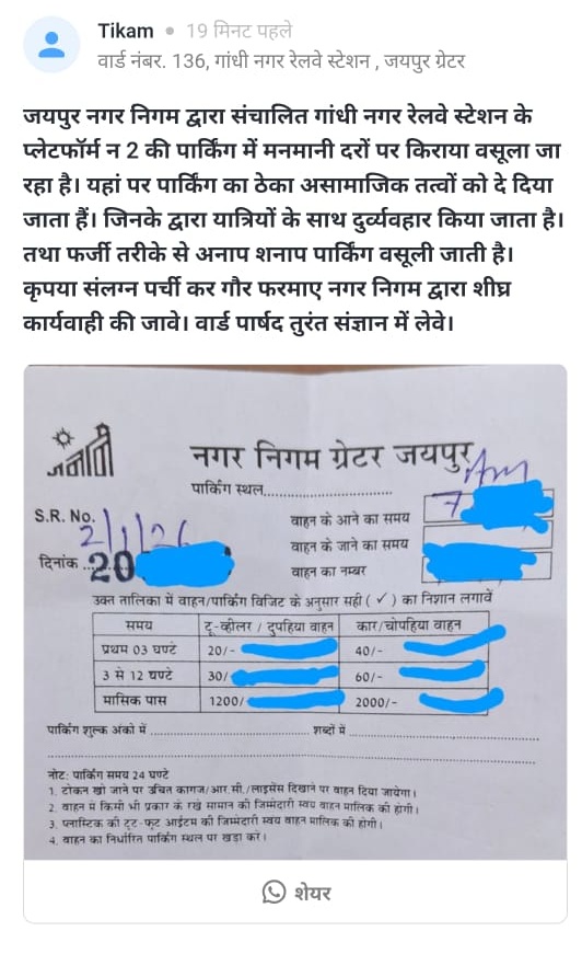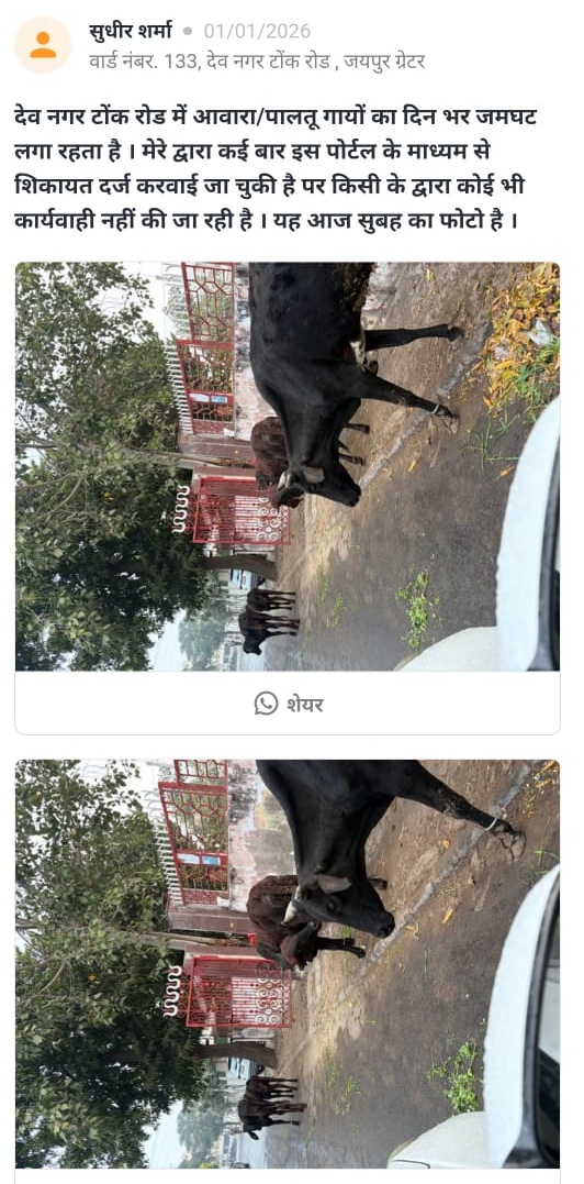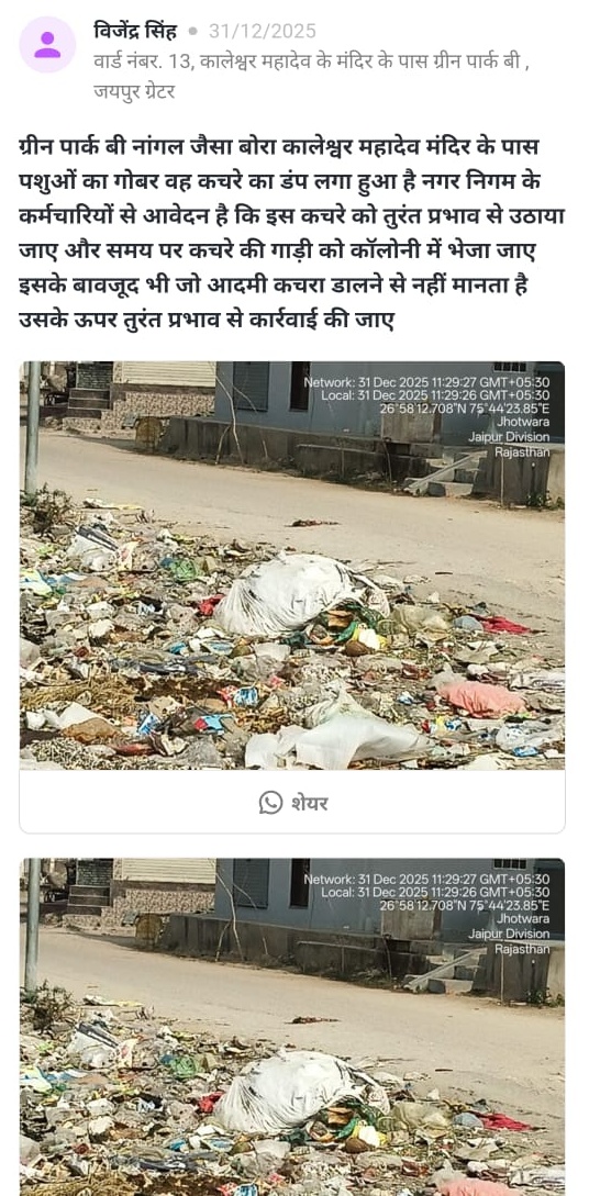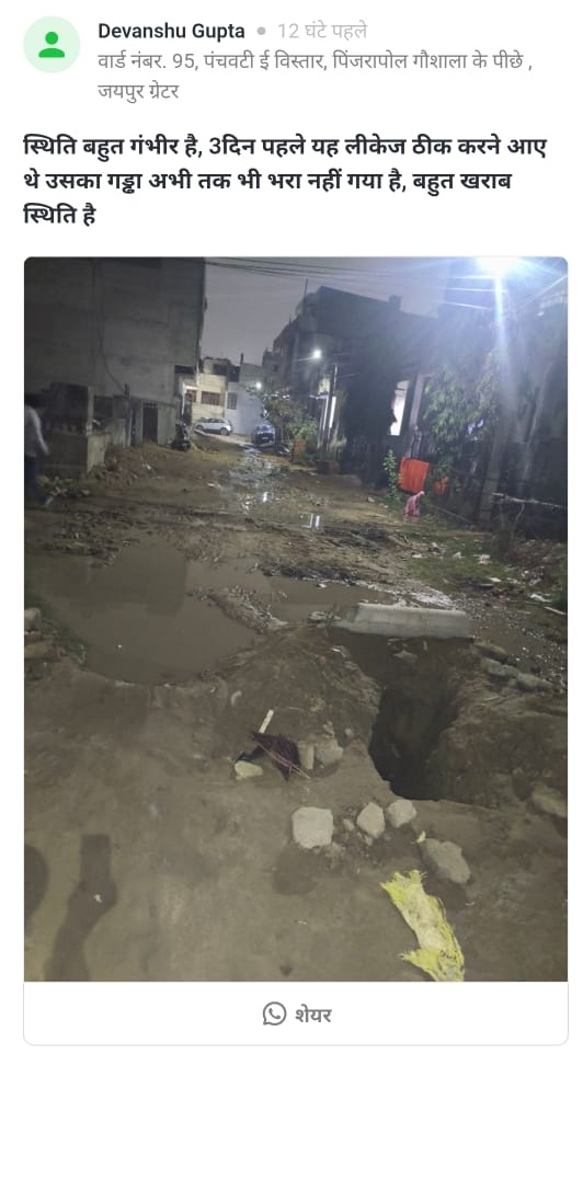 जयपुर शहर के अलग-अलग वार्डों से बुनियादी सुविधाओं को लेकर एक बार फिर गंभीर शिकायतें सामने आई हैं। कहीं सड़क पर खोदे गए गड्ढे जानलेवा बने हुए हैं, तो कहीं कचरा, गोबर और आवारा पशुओं की वजह से लोगों की सेहत पर खतरा मंडरा रहा है। कई इलाकों में टूटी सड़कें और नालियां आवागमन में बड़ी बाधा बन गई हैं, जबकि कुछ स्थानों पर अवैध वसूली जैसी शिकायतों ने भी जनता की परेशानी बढ़ा दी है। लोगों का कहना है कि बार-बार शिकायतों के बावजूद जिम्मेदार विभाग आंख मूंदे बैठे हैं। ऐसी ही आमजन की रोजमर्रा की परेशानियों और शहर की जमीनी हकीकत को पढ़ने के लिए दैनिक भास्कर के सिविक इश्यू सेगमेंट पर क्लिक कर पिंजरापोल गौशाला के पीछे सड़क की हालत बेहद खराब हो गई है। वार्ड नंबर 95 से देवांशु गुप्ता ने बताया कि तीन दिन पहले पानी की लाइन ठीक करने के लिए सड़क खोदी गई थी, लेकिन काम के बाद गड्ढे को वैसे ही छोड़ दिया गया। अब यह गड्ढा राहगीरों और वाहन चालकों के लिए जानलेवा साबित हो सकता है। स्थानीय लोगों का आरोप है कि नगर निगम को कई बार शिकायत के बाद भी कोई कार्रवाई नहीं की गई। ग्रीन पार्क बी, कालेकश्वर महादेव मंदिर के पीछे नांगल जैसा बोरा क्षेत्र में भारी मात्रा में कचरा और आवारा पशुओं का गोबर जमा है। वार्ड 13 के विजेंद्र सिंह ने बताया कि गंदगी के कारण बदबू और बीमारियों का खतरा बढ़ गया है। लोगों ने निगम से सफाई कराने और कचरा फैलाने वालों पर कार्रवाई की मांग की है। देव नगर, टोंक रोड इलाके में आवारा जानवरों का जमावड़ा आम समस्या बन चुका है। वार्ड 133 से सुधीर शर्मा ने कहा कि कई बार शिकायत करने के बावजूद इस समस्या का कोई स्थायी समाधान नहीं हो पाया है, जिससे आए दिन दुर्घटनाओं का खतरा बना रहता है। गड़वाड़ी गांव की सड़कों की हालत भी बदतर है। वार्ड नंबर 11 से दीपक कुमार सोनी ने बताया कि लगभग हर गली-नुक्कड़ पर सड़क टूटी हुई है। मुख्य सड़कों पर बड़े-बड़े गड्ढे और खुली नालियां बनी हैं, जिनमें वाहन फंस जाते हैं और लोगों को भारी परेशानी झेलनी पड़ती है। गांधी नगर रेलवे स्टेशन के प्लेटफॉर्म नंबर-2 की पार्किंग को लेकर भी शिकायत सामने आई है। वार्ड 136 से टीकराम ने बताया कि यहां तय दरों से ज्यादा किराया वसूला जा रहा है और यात्रियों के साथ दुर्व्यवहार भी किया जाता है। आम जनता ने नगर निगम और संबंधित विभागों से मांग की है कि इन समस्याओं का जल्द स्थायी समाधान किया जाए। लोगों का कहना है कि यदि समय रहते कार्रवाई नहीं हुई, तो हालात और भी गंभीर हो सकते हैं। आप भी कर सकते है पोस्ट अब लोग अपनी बात सीधे दैनिक भास्कर ऐप पर रख रहे हैं। दैनिक भास्कर ऐप के 'सिविक इश्यू' सेक्शन में गली या मोहल्ले की समस्या लिखकर और फोटो लगाकर पोस्ट की जा सकती है। अगर आपने इस सेक्शन में किसी 