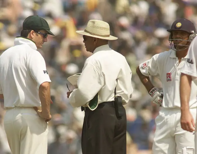 इमेज कैप्शन, मार्च 2001 में भारत-ऑस्ट्रेलिया के बीच टेस्ट मुक़ाबले के दौरान अम्पायर एसके बंसल (बीच में)