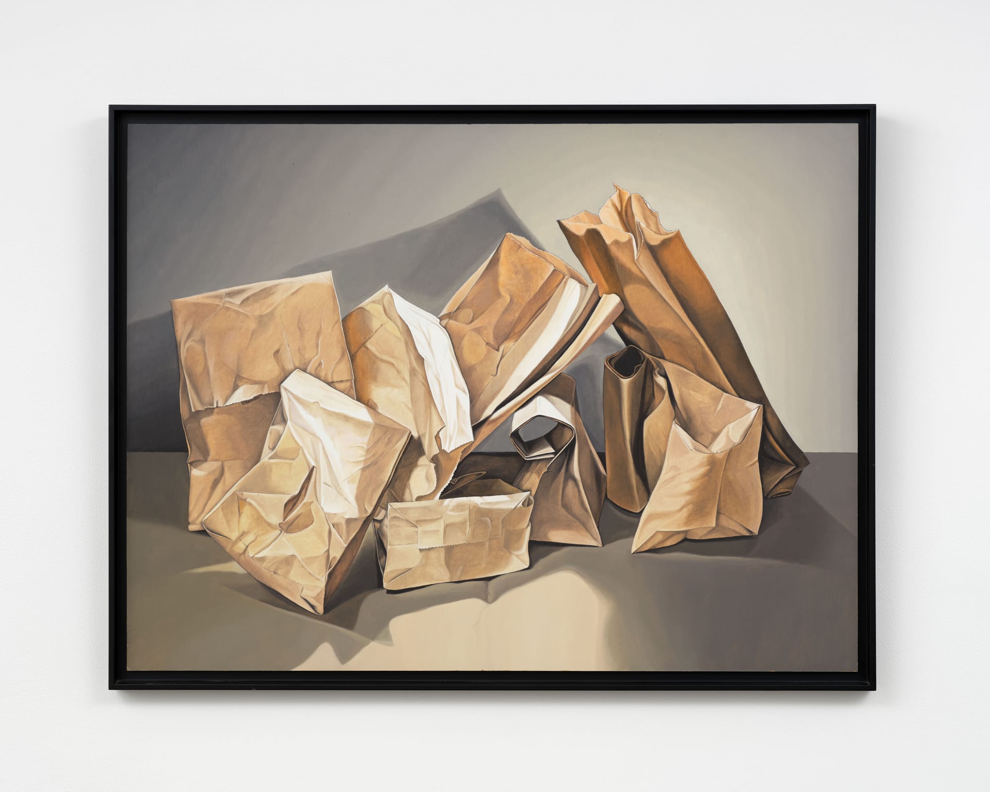 Marina Stern, "(Bags)" (2023), oil on board (photo by Paul Salveson, courtesy the artist’s estate and Bel Ami, Los Angeles)
