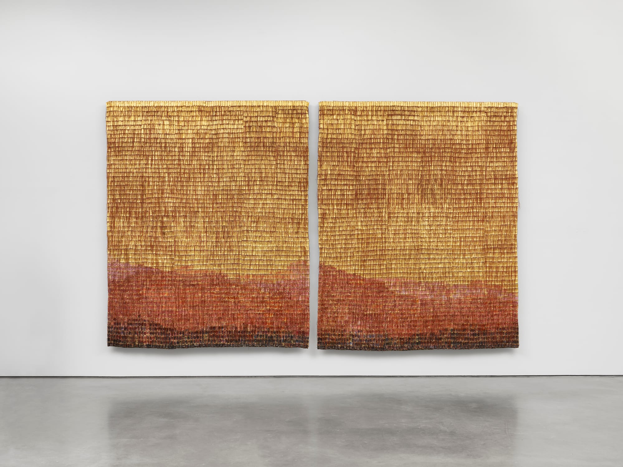 Olga de Amaral, "Alquimia 41 (díptico)" (1987), linen, gesso, acrylic, Japanese paper, and gold leaf (© Olga de Amaral; photo courtesy Lisson Gallery)