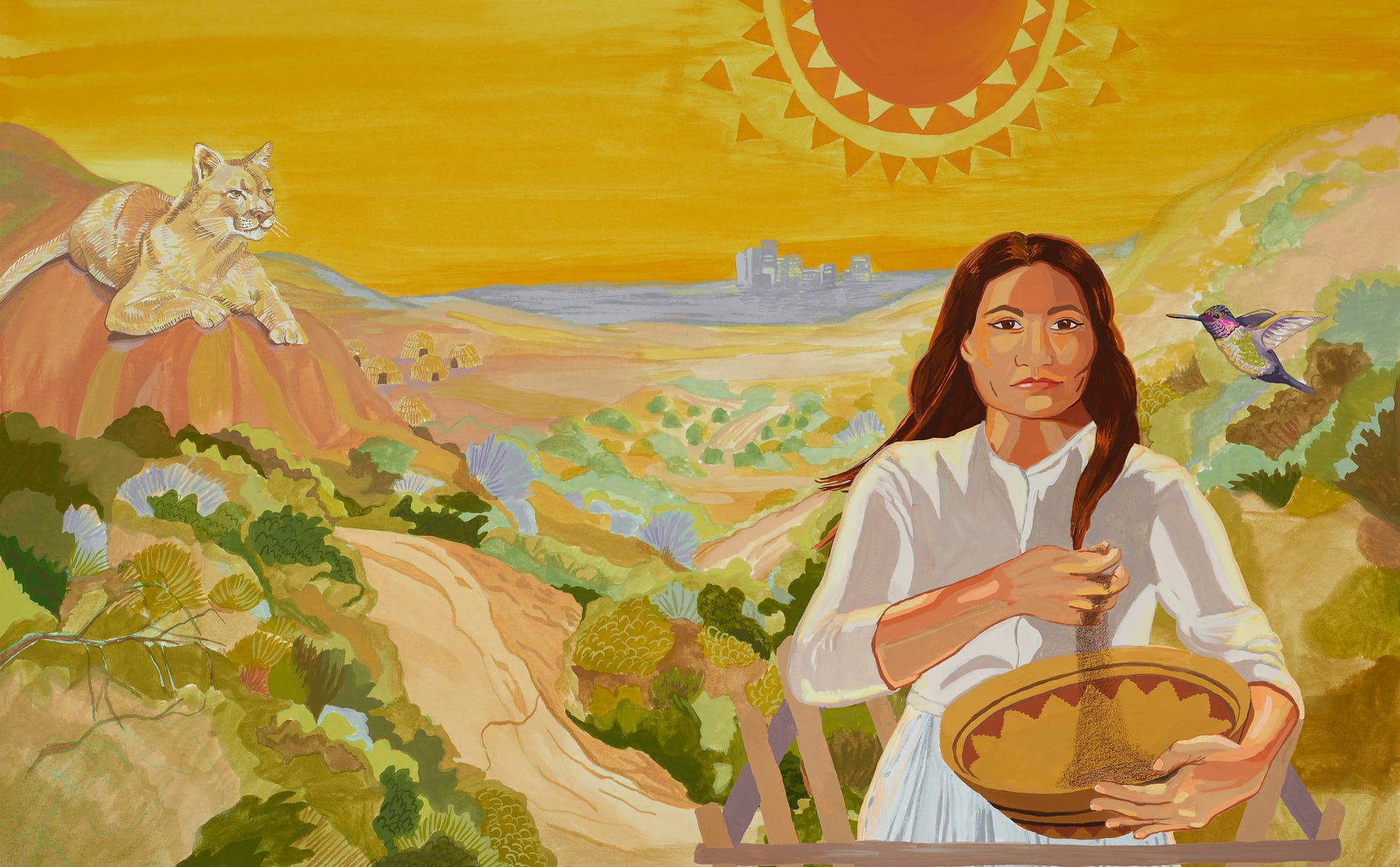 Katie Dorame, "Toypurina: Japchavit Leader, Medicine Woman, Tongva Rebel" (2024), gouache on paper, print reproductions (courtesy the artist and Angels Gate Cultural Center)