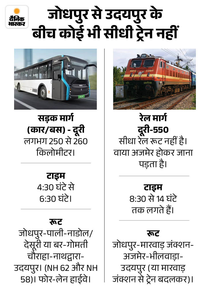 जोधपुर और उदयपुर शहर को एक बार फिर रेल लाइन से जुड़ने की उम्मीद जगी है। प्रोजेक्ट पूरा होने पर दोनों शहरों के बीच की दूरी 250 किमी कम हो जाएगी। उत्तर पश्चिम रेलवे (NWR) के महाप्रबंधक अमिताभ शनिवार को जोधपुर पहुंचे। उन्होंने कहा कि रेल लाइन के लिए एक बार फिर सर्वे शुरू किया गया है। महाप्रबंधक ने कहा- रेलवे ने जोधपुर-उदयपुर कनेक्टिविटी को लेकर नए स्तर पर काम शुरू किया है। इसके तहत मारवाड़ जंक्शन से नाथद्वारा के बीच मौजूद पुराने मीटर गेज रूट को ब्रॉड गेज में बदलने के लिए सर्वे किया जा रहा है। इससे पहले पहाड़ी क्षेत्र और वन विभाग की आपत्तियों के कारण इस प्रोजेक्ट को बीच में ही छोड़ दिया गया था। बताया जा रहा है कि पहाड़ काटकर रेलवे लाइन के लिए रास्ता बनाया जाएगा। महाप्रबंधक के मुताबिक अब रेल मंत्री अश्विनी वैष्णव के हस्तक्षेप के बाद इसे फिर से शुरू किया गया है। यदि यह लाइन जुड़ती है, तो जोधपुर-उदयपुर के बीच की दूरी करीब ढाई सौ किमी कम हो जाएगी। जो पर्यटन और व्यापार के लिए गेम-चेंजर साबित होगी। भगत की कोठी में बनेगा एक नया कोचिंग टर्मिनल जीएम ने बताया- रेलवे बोर्ड ने अगले 5 साल में देश के 48 प्रमुख स्टेशनों की क्षमता दोगुनी करने का लक्ष्य रखा है, जिसमें जयपुर के साथ जोधपुर भी शामिल है। जोधपुर शहर के बीचों-बीच से गुजरने वाली माल गाड़ियों के कारण यात्री ट्रेनों पर प्रतिकूल असर अब बीते जमाने की बात होने वाली है। भगत की कोठी (BGKT) में 450 करोड़ रुपए की लागत से एक नया कोचिंग टर्मिनल बनेगा। वहीं, जोधपुर-उदयपुर कनेक्टिविटी को लेकर भी रेलवे ने नए स्तर पर कवायद शुरू की है। मालगाड़ियों का रूट होगा डायवर्ट, खत्म होगी समस्या महाप्रबंधक ने स्वीकार किया कि वर्तमान में BGKT-जोधपुर रूट से कई माल गाड़ियां गुजरती हैं। इस वजह से यात्री ट्रेनों के यातायात पर भी असर पड़ता है और उन्हें सिग्नल के लिए इंतजार करना पड़ता है। इस समस्या के स्थायी समाधान के लिए जोधपुर को बाईपास करने वाली नई लाइन की योजना बनाई गई है। फिलहाल इस लाइन के अलाइनमेंट और तकनीकी पहलुओं पर अध्ययन चल रहा है। बाईपास लाइन बनने के बाद माल गाड़ियां शहर के मुख्य स्टेशन पर आए बिना बाहर से ही निकल जाएंगी। इससे जोधपुर स्टेशन पर दबाव कम होगा और मुख्य फोकस यात्री सुविधाओं पर रहेगा। भगत की कोठी: 450 करोड़ का टर्मिनल और नई ट्रेनों की उम्मीद अभी जोधपुर से नई ट्रेनें चलाने में सबसे बड़ी बाधा 'रखरखाव सुविधाओं' की कमी है। इस कमी को दूर करने के लिए भगत की कोठी में करीब 400 से 450 करोड़ रुपए की लागत से मॉडर्न 'कोचिंग टर्मिनल' बनाने का प्रस्ताव रेलवे बोर्ड को भेजा गया है। महाप्रबंधक ने बताया कि इस प्रोजेक्ट की प्रारंभिक बैठक हो चुकी है। यह टर्मिनल सिर्फ पार्किंग नहीं, बल्कि ट्रे