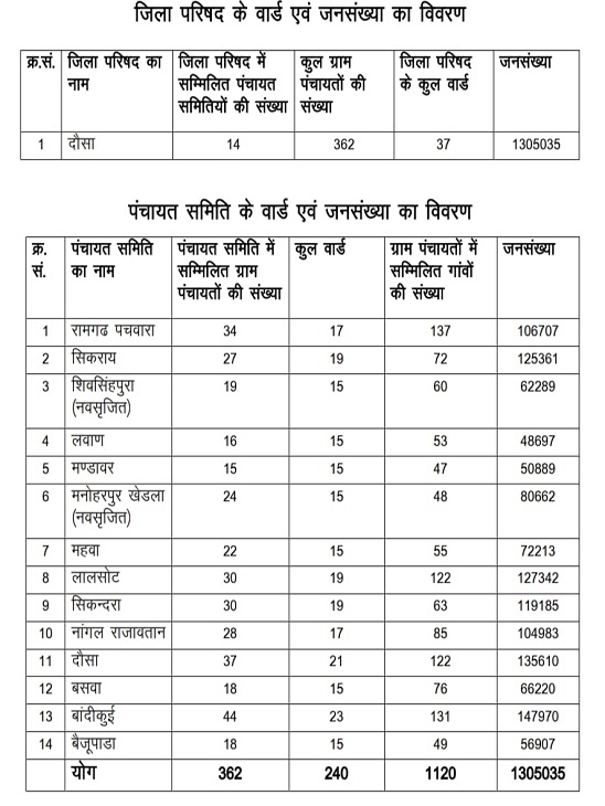 दोनों में अब इतने वार्ड होंगे कलेक्टर ने बताया कि दौसा जिला परिषद में अब 37 वार्ड होंगे। इसी प्रकार रामगढ़ पचवारा पंचायत समिति में 17, सिकराय में 19, शिवसिंहपुरा में 15, लवाण में 15, मंडावर में 15, मनोहरपुर खेड़ला में 15, महवा में 15, लालसोट में 19, सिकंदरा में 19, नांगल राजावतान में 17, दौसा में 21, बसवा में 15, बांदीकुई में 23 एवं बैजूपाड़ा पंचायत समिति में 15 वार्ड होंगे।
