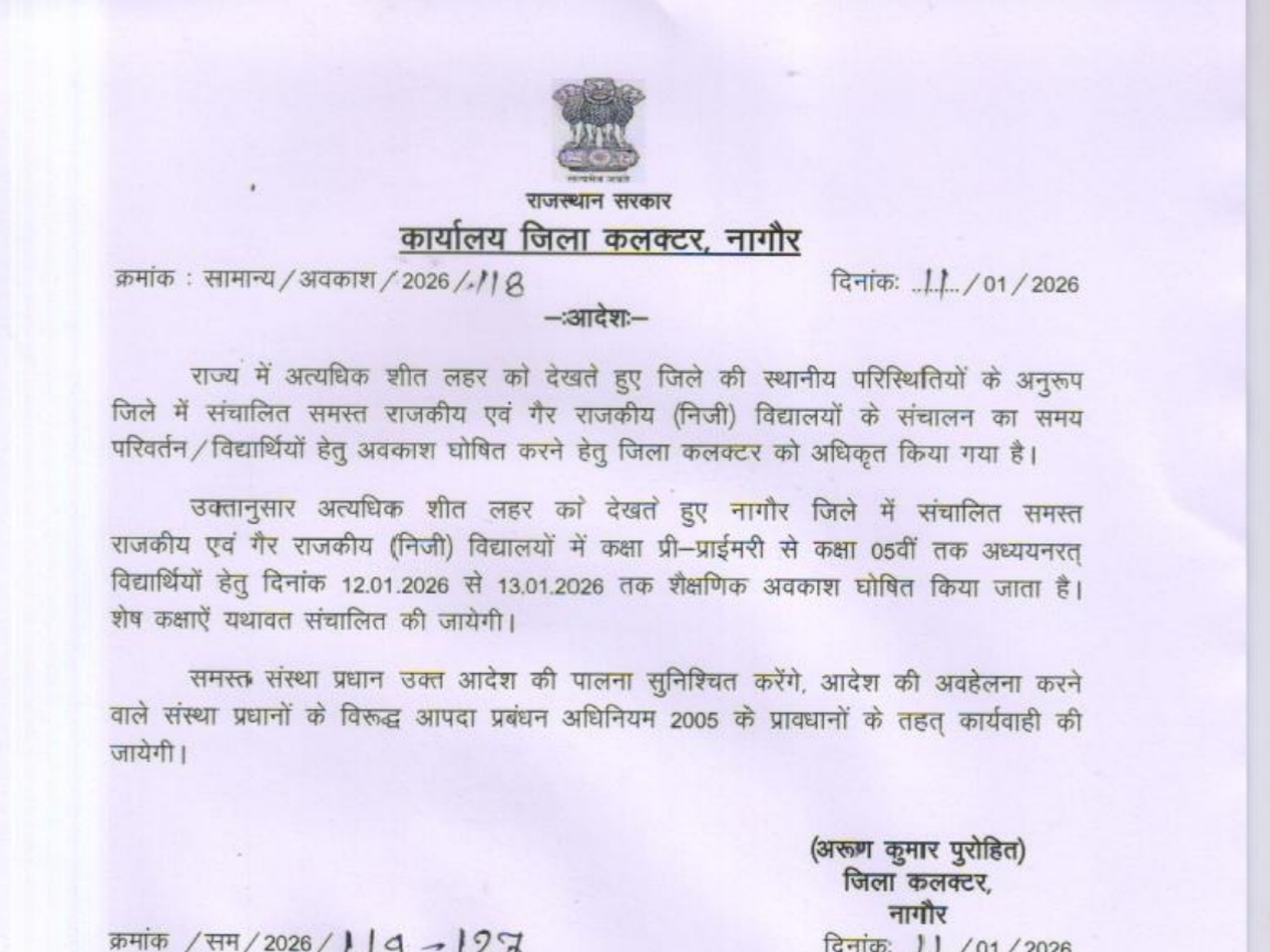 नागौर जिले में भीषण सर्दी और शीतलहर के बढ़ते प्रकोप को देखते हुए जिला प्रशासन ने छोटे बच्चों को राहत देने के लिए एक बड़ा फैसला लिया है। जिला कलेक्टर अरुण कुमार पुरोहित ने रविवार को आदेश जारी कर जिले के सभी स्कूलों में प्राथमिक स्तर के विद्यार्थियों क