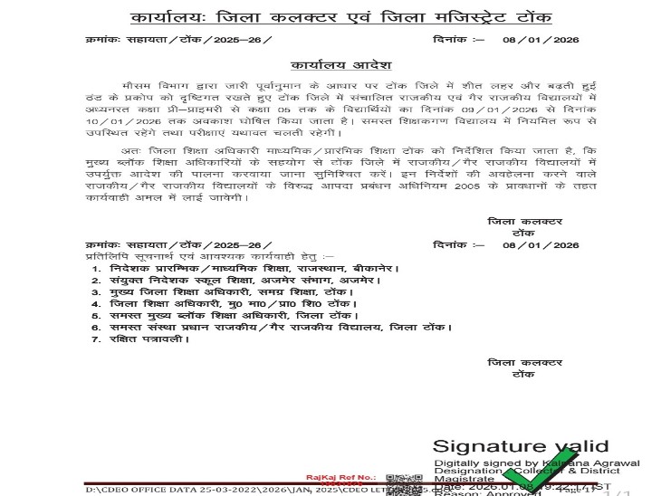 टोंक कलेक्टर कल्पना अग्रवाल ने कक्षा प्री-प्राइमरी से 5 वीं तक के सभी राजकीय एवं गैर राजकीय विद्यालयों में अध्ययनरत विद्यार्थियों का अवकाश घोषित किया है। यह अवकाश मात्र विद्यार्थियों के लिए है। टीचर स्कूल जाएंगे। इस बार कक्षा 6 से कक्षा 8 तक के बच्चों के लिए कलेक्टर कल्पना अग्रवाल ने छुट्टियां नहीं बढ़ाई है। यह अवकाश कलेक्टर ने मौसम विभाग की ओर से टोंक जिले में आने वाले दिनों में और तेज ठंड और शीतलहर को ध्यान में रखते हुए दी है। 9 और 10 जनवरी को स्कूल बंद रहेंगे अभी कुछ दिन से सुबह और रात के समय ठंड ज्यादा बढ़ रही है। ऐसे में छोटे बच्चों को ठंड से बचाना जरूरी हो गया है। इसी को देखते हुए जिला प्रशासन ने छोटे बच्चों के लिए छुट्टी का फैसला लिया है। यह आदेश कलेक्टर कल्पना अग्रवाल ने दिए है। आंगनबाड़ी केंद्रों के बच्चों के लिए पहले ही 10 जनवरी तक छुट्टी की जा चुकी है। जिला प्रशासन ने जिले के सभी सरकारी और गैर सरकारी स्कूलो में पढ़ने वाले बच्चों के लिए 9 और 10 जनवरी को छुट्टी घोषित की है। यह छुट्टी कक्षा 1 से कक्षा 5 तक के सभी छात्र-छात्राओं के लिए लागू होगी। बच्चों की सुरक्षा के लिए लिया गया फैसला प्रशासन का कहना है कि यह फैसला बच्चों के स्वास्थ्य को ध्यान में रखते हुए लिया गया है। तेज ठंड और शीतलहर से बच्चों को सर्दी, खांसी और अन्य बीमारियों का खतरा रहता है। इसलिए सावधानी के तौर पर उन्हें घर पर ही सुरक्षित रखने का फैसला किया गया है। यह छुट्टी सिर्फ बच्चों के लिए है। स्कूलों और आंगनवाड़ी केंद्रों में काम करने वाले शिक्षक, कर्मचारी और अन्य स्टाफ अपने काम पर नियमित रूप से उपस्थित रहेंगे। संस्थान खुले रहेंगे, लेकिन बच्चों की कक्षाएं नहीं लगेंगी। आदेश का पालन करना जरूरी जिला प्रशासन ने सभी स्कूलों और आंगनवाड़ी केंद्रों के संस्था प्रधानों को आदेश का पूरी तरह पालन करने के निर्देश दिए हैं। अगर कोई संस्था इस आदेश का पालन नहीं करती है, तो उसके खिलाफ कार्रवाई की जाएगी। यह आदेश कलेक्टर कल्पना अग्रवाल की ओर से जारी किया गया है।