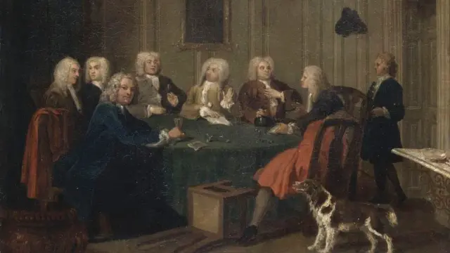 Fotoğraf altı yazısı, Joseph Highmore tablosunda 1730'larda Londra'da bir centilmen kulübü.