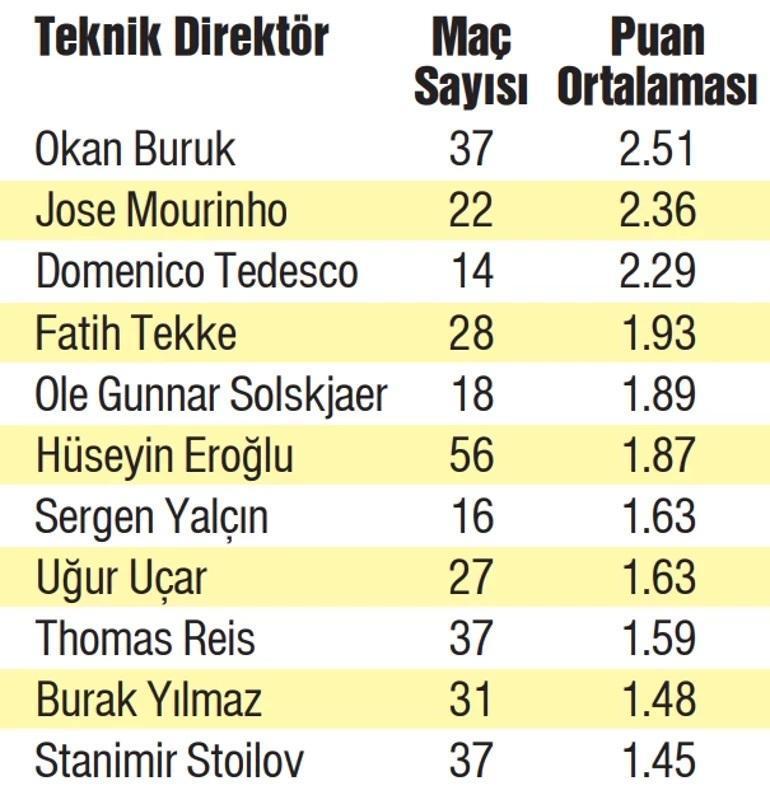 Sıralamada ikinci basamakta Fenerbahçe'nin Portekizli teknik patronu Jose Mourinho yer aldı. Mourinho, 22 lig maçında 2.36 puan ortalaması tutturdu. Onu, sezonun kalan bölümünde göreve gelen Domenico Tedesco takip etti. İtalyan çalıştırıcı, 14 karşılaşmada 2.29 puan ortalamasıyla üçüncü sırada kaldı.2025'te 54 Maçta 37 GalibiyetOkan Buruk'un Galatasaray'ı 2025 yılında toplam 54 resmi maça çıktı. Bu karşılaşmaların dağılımı şu şekilde: 37 Süper Lig, 6 UEFA Şampiyonlar Ligi, 4 UEFA Avrupa Ligi ve 7 Türkiye Kupası mücadelesi. Sarı-kırmızılılar, bu maçlarda 37 galibiyet, 10 beraberlik ve 7 mağlubiyet aldı. Rakip filelere 115 gol gönderen Aslan, kalesinde ise 48 gol gördü.