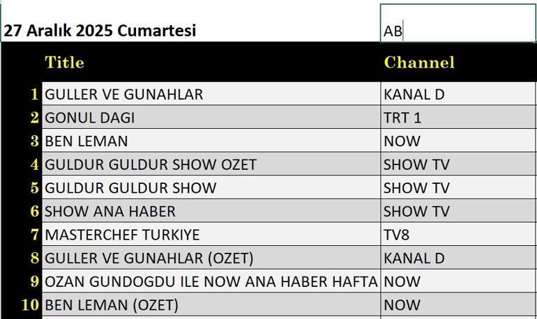27 ARALIK REYTİNG SONUÇLARI: Güller ve Günahlar, Gönül Dağı, Güldür Güldür Show, Ben Leman, Taşıyıcı 2, Kara Bela, MasterChef Türkiye gecenin birincisi kim oldu? İşte 27 Aralık reytingleri...