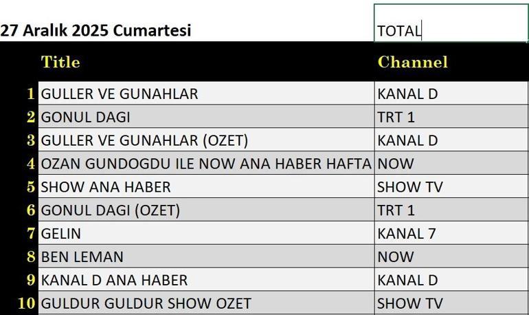 27 Aralık Cumartesi reyting sonuçları açıklandı. 27 Aralık reyting sonuçları şöyle;