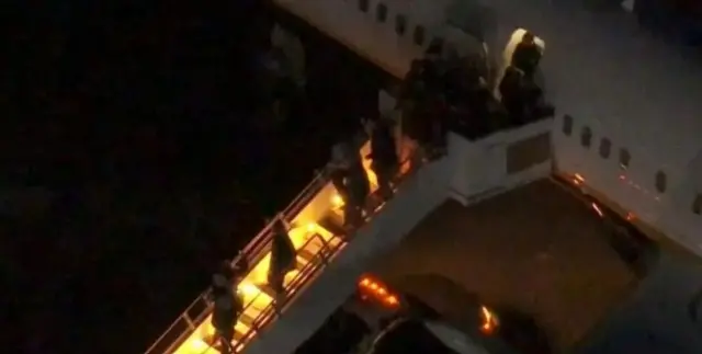 Fotoğraf altı yazısı, Nicolas Maduro olduğu düşünülen bir kişinin de aralarında bulunduğu büyük bir grup uçaktan iniyor.