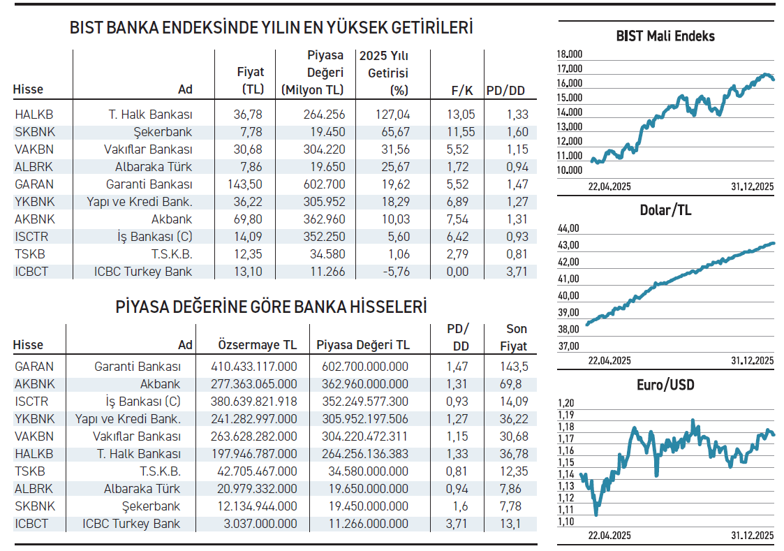 BIST Banka Endeksi 2025’te %13,64 yükselirken, endekse dahil 10 hisseden 6’sı ortalamanın üzerinde getiri sağladı. Halkbank %127,04 ile zirveye çıkarken, ICBC Turkey yılı ekside tamamlayan tek banka oldu.