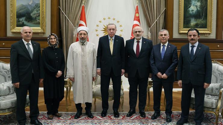 Cumhurbaşkanı Erdoğan, Diyanet İşleri Başkanı Safi Arpaguş ve beraberindeki heyeti kabul etti. Basına kapalı gerçekleşen kabulden fotoğraf paylaşıldı. (DHA)