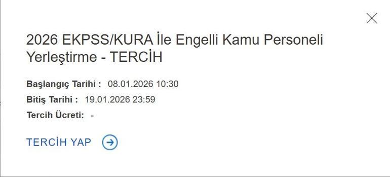 Engelli Kamu Personel Seçme Sınavı ve Engellilerin Devlet Memurluğuna Alınmaları Hakkında Yönetmelik uyarınca ÖSYM tarafından yapılan Engelli Kamu Personeli Seçme Sınavı (EKPSS) sonuçları ve kura usulü ile kamu kurum ve kuruşlarının boş kadrolarına yerleştirme yapılacaktır. Adaylar, 2026-EKPSS/Kura İle Engelli Kamu Personeli Yerleştirme Tercih Kılavuzu'na aşağıdaki bağlantıdan erişebilecektir.