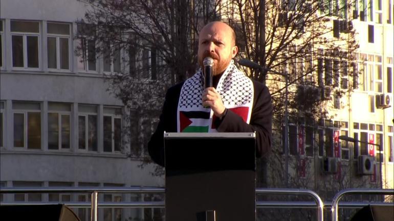 İlim Yayma Vakfı Mütevelli Heyeti Başkanı Bilal Erdoğan, İsrail'in Filistin'deki katliamına "dur" demek için Galata Köprüsü'nde düzenlenen eylemde konuşuyor.