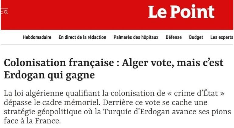 Fransa merkezli Le Point dergisi, Cezayir’in Fransız sömürgeciliğini “devlet suçu” olarak tanımlayan yasasını mercek altına aldı. Dergi, yayımladığı yazıda Cezayir’deki bu tarihi sürecin kazananının Cumhurbaşkanı Recep Tayyip Erdoğan olduğunu ifade etti.
