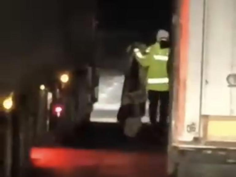 Bu yöntemi birkaç kez tekrarlayan polis memuru, TIR’ın kontrollü şekilde hareket etmesini sağlayarak aracı yolun sağına çektirdi. O anlar, cep telefonu kamerasıyla görüntülendi.
