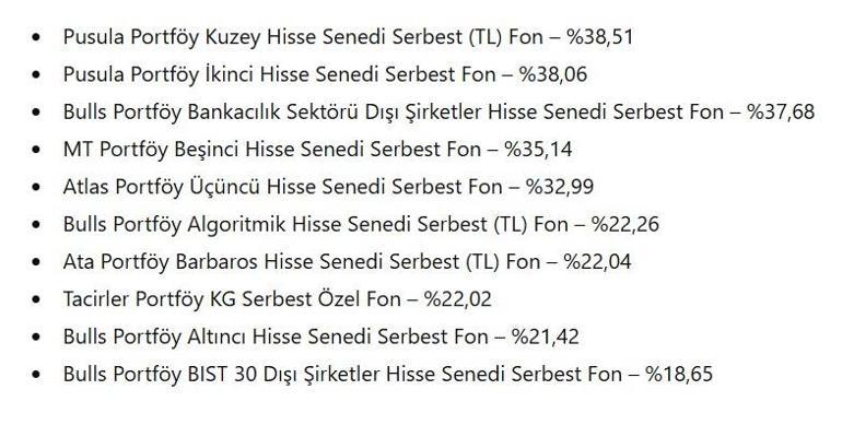 Bu hafta yatırım fonları arasında en yüksek getiriyi yüzde 38,51 ile Pusula Portföy Kuzey Hisse Senedi Serbest (TL) Fon sağladı. Bunu yüzde 38,06 ile Pusula Portföy İkinci Hisse Senedi Serbest Fon ve yüzde 37,68 ile Bulls Portföy Bankacılık Sektörü Dışı Şirketler Hisse Senedi Serbest Fon izledi.