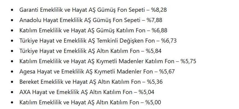 Emeklilik fonları arasında ise bu hafta Garanti Emeklilik ve Hayat AŞ Gümüş Fon Sepeti Emeklilik Yatırım Fonu, yüzde 8,28 getiriyle ilk sırayı aldı.