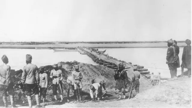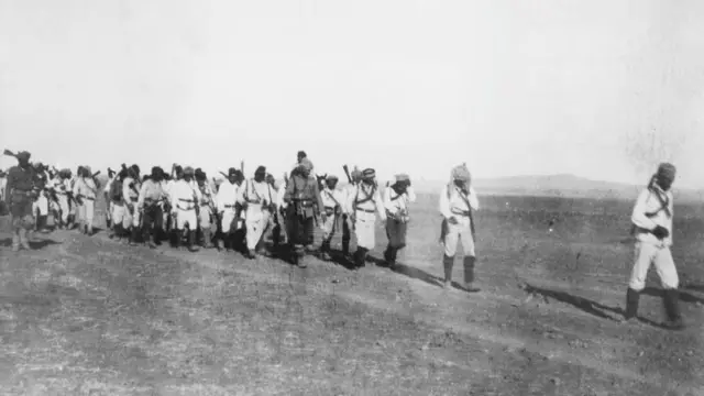 Fotoğraf altı yazısı, I. Dünya Savaşı'nın Mezopotamya Seferi sırasında, Eylül 1915'te Irak'taki Kut şehrine doğru ilerleyen Osmanlı İmparatorluğu askerleri.