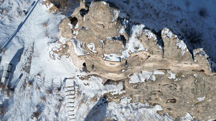Kayseri’nin Yeşilhisar ilçesi Soğanlı Mahallesi’ndeki vadi, kar yağışı sonrası beyaza büründü. Kent merkezine 86, ilçe merkezine ise 15 kilometre uzaklıkta yer alan, kaya kiliseleri ve mağaraların bugünkü evler ile iç içe geçtiği bir vadi içerisinde bulunan bölge dronla görüntülendi.