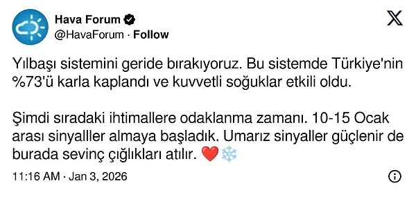 Popüler meteoroloji sayfalarından Hava Forum, 10–15 Ocak tarihleri arasında yeniden kar yağışı beklendiğini duyurdu.