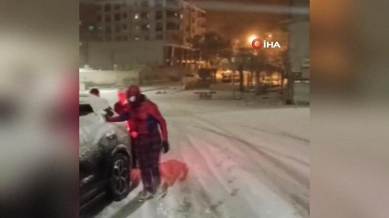 Bitlis’te kar nedeniyle yolda kalan bir sürücünün imdadına çevredekiler yetişti. Yardım edenler arasında Örümcek Adam kostümlü bir genç de vardı.