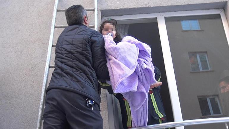 Ekipler, merdivenle çıktıkları pencereyi levye ile açarak içeri girdi. Evden çıkarılan ve 1,5 yaşında olduğu öğrenilen Gökçe bebek, sağlık görevlilerine teslim edildi.
