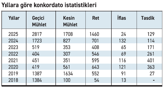 Geçen yılın tamamında mahkemeler 2 bin 817 adet dosya için konkordato geçici mühlet kararı verirken, bu sayı tarihi zirve olarak dikkat çekti. 2025’in tamamındaki konkordato sayısı 2022, 2023 ve 2024’ün toplamını da geçti.