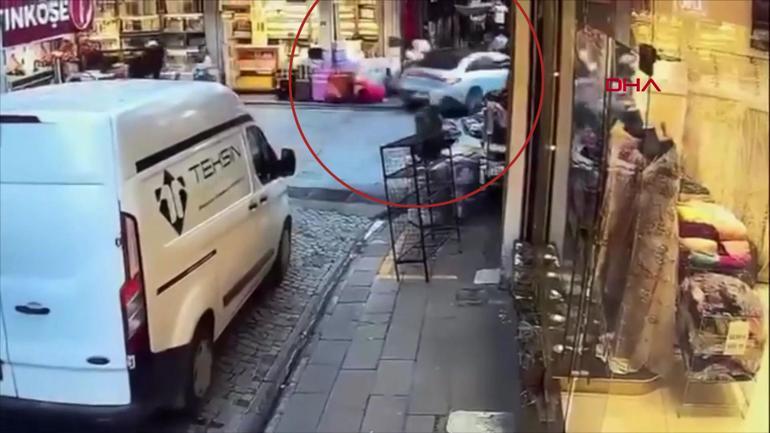 İstanbul Eminönü’nde meydana gelen olayda, ara sokaktan çıkan otomobilin bir anda hızlanarak önce motosikletli bir kişiye çarptığı, ardından kontrolünü kaybederek dükkâna daldığı görüldü.