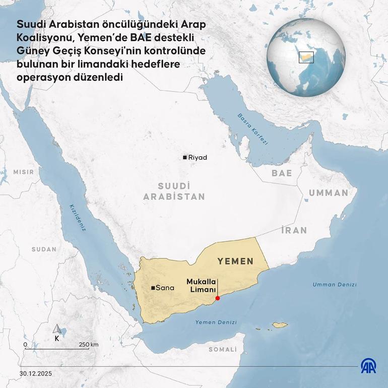 Yemen'de meşru hükümete destek veren Suudi Arabistan öncülüğündeki Arap Koalisyonu, Hadramevt'te ayrılıkçı Güney Geçiş Konseyi'nin (GGK) kontrolünde bulunan Mukalla Limanı'nda bazı silah ve savaş araçlarının hedef alındığı "sınırlı bir askeri operasyon" gerçekleştirdiğini duyurdu.