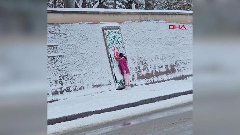 Aksaray’da 7 yaşındaki Zeynep Ebrar Berk, karla kaplanan Türk bayrağı motiflerini temizleyip öptü. Belediye ekiplerince kaydedilen bu anlar sosyal medyada büyük beğeni toplarken, Zeynep’e Türk bayrağı hediye edildi.