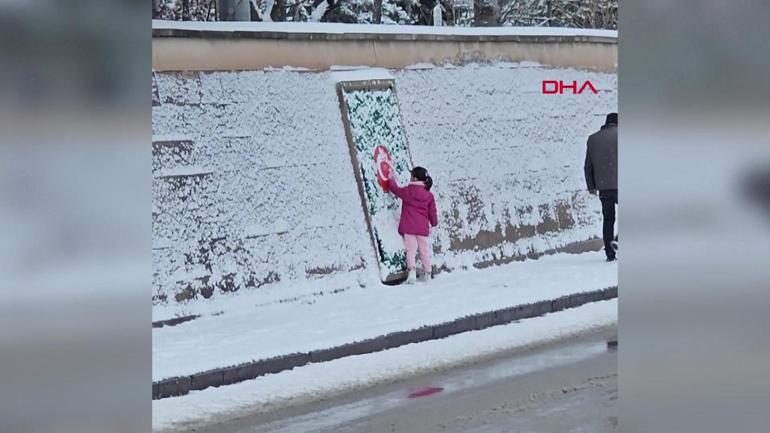 Minik ellerle büyük saygı... Karları temizledi, Türk bayrağını öptü!