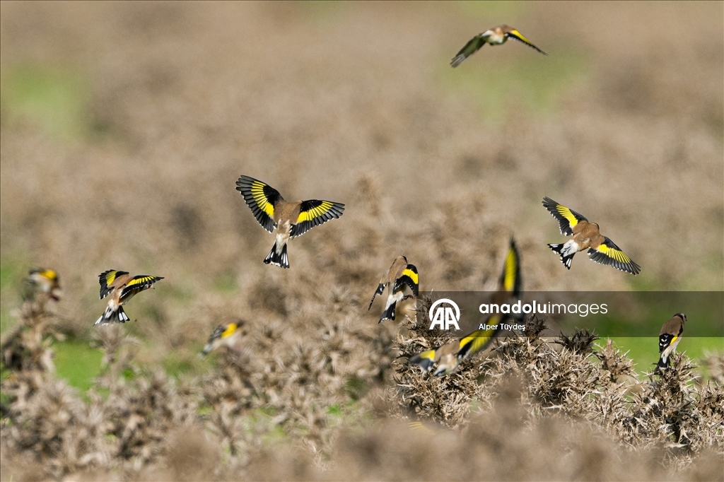 Parlak renkleri ve güzel ötüşü ile dikkati çeken saka kuşları, Bursa'daki kırlarda sürüler halinde dolaşırken görüntülendi.