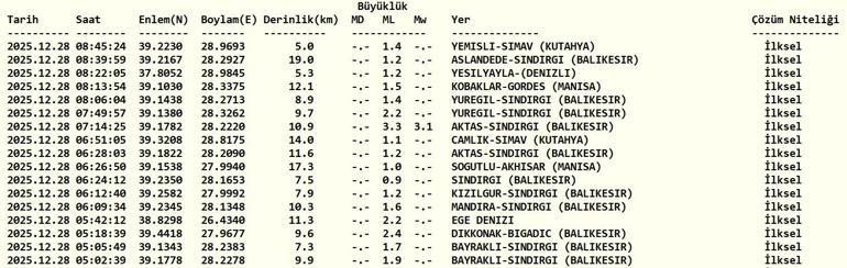 Son dakika deprem haberleri ile ilgili araştırmalar Ege depremi, son dakika Kütahya depremi, İstanbul deprem, Bursa depremi, Van depremi, Osmaniye depremi ve Balıkesir depremi haberlerinin ardından yoğunluk kazandı. Bulundukları bölgede sarsıntı hisseden çok sayıda vatandaş "28 Aralık Pazar deprem mi oldu? Nerede, kaç şiddetinde? Ege'de deprem mi oldu?, Ege Denizi'nde deprem mi oldu? İstanbul'da deprem mi oldu?, Balıkesir'de deprem mi oldu?, Hatay'da deprem mi oldu?, Kütahya'da deprem mi oldu?" sorularına yanıt arıyor. Peki, bugün deprem mi oldu? Deprem nerede oldu, kaç şiddetinde? İşte, 28 Aralık Pazar günü Kandilli Rasathanesi ve AFAD tarafından yayımlanan son depremler listesi...