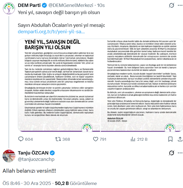 Bolu Belediye Başkanı Tanju Özcan, DEM'in paylaştığı Abdullah Öcalan'ın yeni yıl mesajına tepki gösterdi.